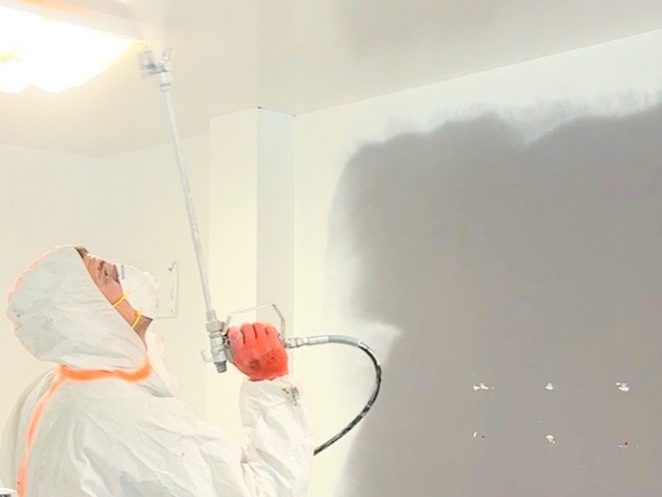 Airless машината засмуква латекса директно от кофата и го подава под налягане през специална дюза. Така боята се разпръсква на микрокапки и се нанася гладко и равномерно върху стените или тавана.